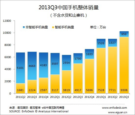 根據Enfodesk易觀智庫最新發布的《2013年第3季度中國手機市場監測報告》顯示,3季度中國手機(不含水貨和山寨機)銷量為10266萬臺,環比增長13.6%,同比增長54.5%。其中,智能手機銷量為9308萬臺,環比增長率為20.7%,同比增幅更是高達89.3%。智能手機占整體市場份額持續上升至90.7%。
