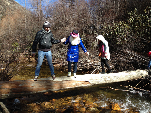 陽光明媚,讓在成都霧霾天氣下待久了的我們瞬間雀躍起來,途中經過一條不知名的河流,大家高興的玩了起來~~~