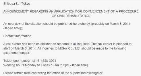 據(jù)國(guó)外媒體報(bào)道,剛剛宣布破產(chǎn)的Mt.Gox日前在其官網(wǎng)上發(fā)布了一則日語(yǔ)和英語(yǔ)的公告,并提供了一個(gè)電話號(hào)碼,接受來自所有用戶任何有關(guān)于Mt.Gox問題的詢問。