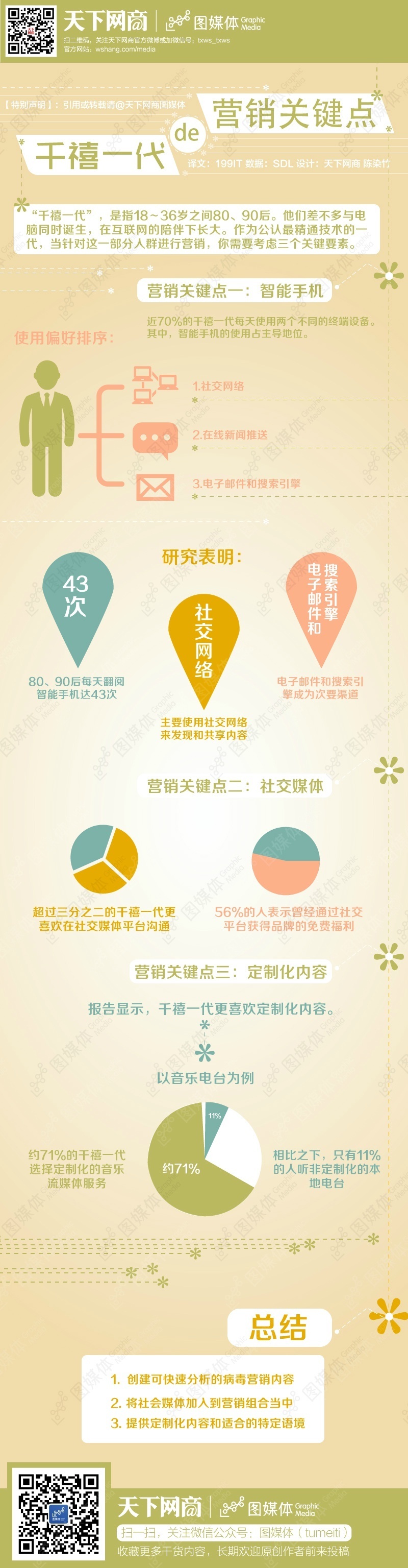 “千禧一代”是指18~36歲之間80、90后。他們差不多與電腦同時誕生,在互聯(lián)網(wǎng)的陪伴下長大。針對這一部分人群進行營銷,你需要考慮三個關(guān)鍵要素:智能手機、社交媒體和定制化內(nèi)容。