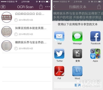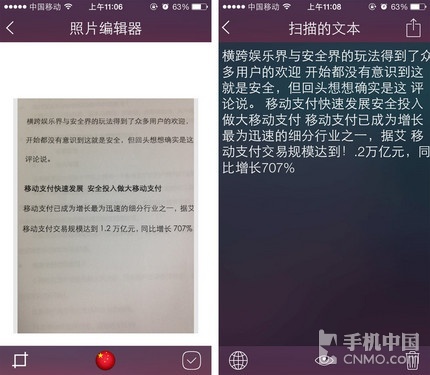 《光學字符識別》的使用方法非常簡單,只要對準要編輯的文本拍下一張照片即可,別忘了選擇一下需要翻譯的語言,應用會自動對圖片中的文本進行識 別。小編測試了幾個不同字體不同材質(zhì)的圖片,白色打印紙黑色字體識別率最高,雜志印刷效果次之,而色彩差異比較大的廣告單頁則效果不太好。不過“翻譯”的 時間有點長,需要耐心等待一小會,但肯定比打字要來的快多了。