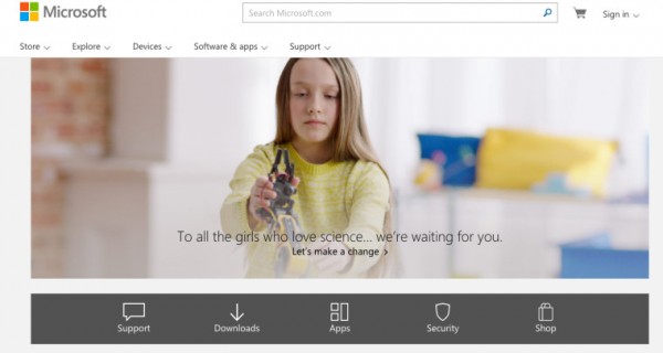 目前,微軟官網(wǎng)首頁的重點是婦女影響技術(shù),這是一個敏感的話題,因為科技業(yè)傳統(tǒng)上由男性主導(dǎo)。就目前的布局而言,英雄形象的重點是對科學(xué)感興趣的少女,而頁腳圖像是11位女性科技業(yè)領(lǐng)導(dǎo)者,她們正在改變創(chuàng)新生態(tài)系統(tǒng)。