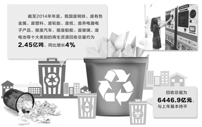 日前,商務(wù)部會(huì)同有關(guān)單位完成了《中國(guó)再生資源回收行業(yè)發(fā)展報(bào)告(2015)》,該報(bào)告顯示,截至2014年底,我國(guó)廢鋼鐵、廢有色金屬、廢塑料、廢輪胎、廢紙、廢棄電器電子產(chǎn)品、報(bào)廢汽車、報(bào)廢船舶、廢玻璃、廢電池等10大類別的再生資源回收總量約為2.45億噸,同比增長(zhǎng)4%;回收總值為6446.9億元,與上年基本持平。