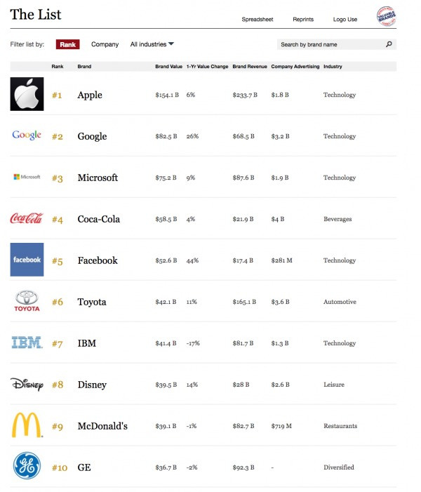 福布斯發(fā)全球最具價值品牌:蘋果連續(xù)六年榜首